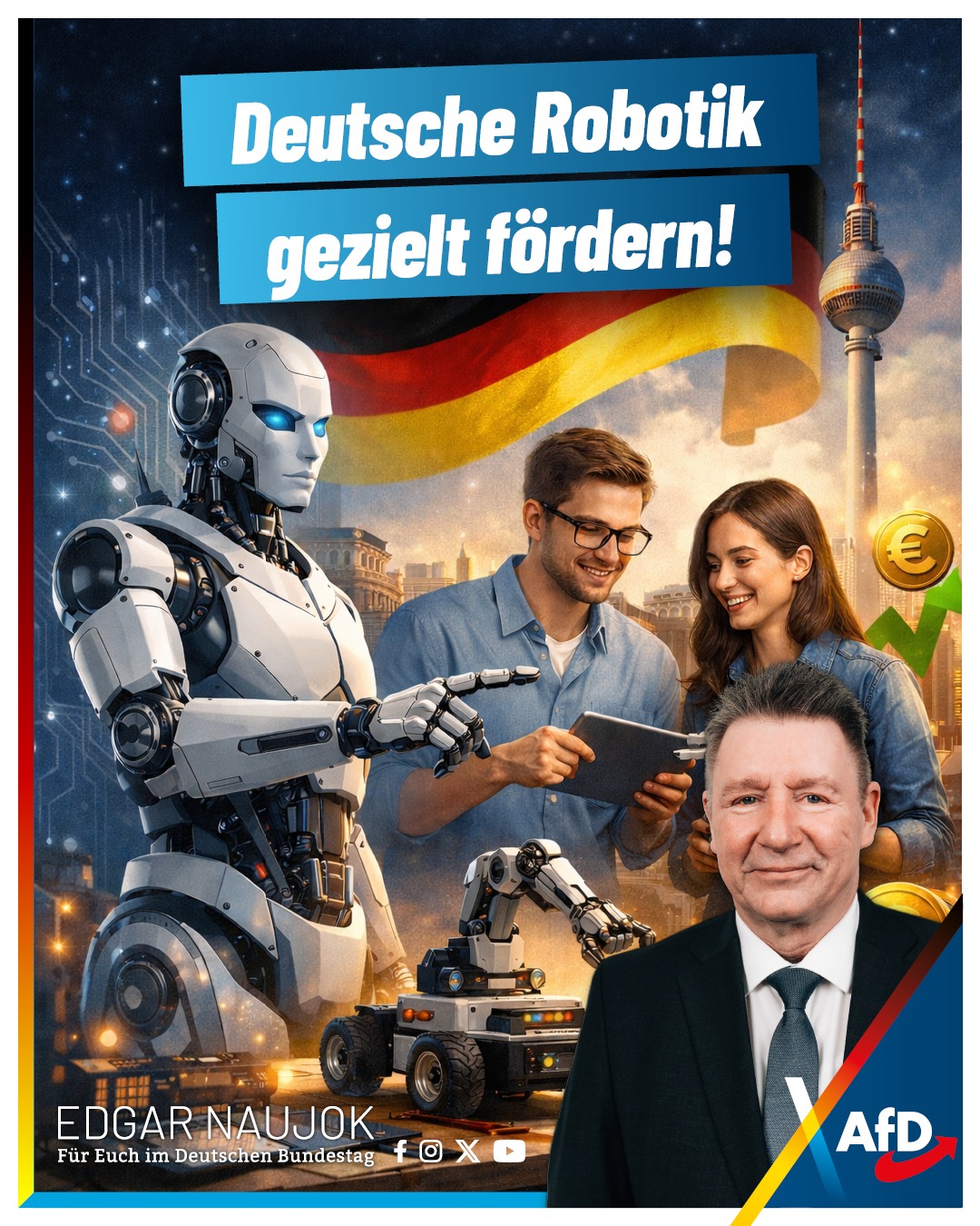 Der AfD-Bundestagsabgeordnete Edgar Naujok, Berichterstatter für Robotik im Ausschuss für Digitales und Staatsmodernisierung, kommentiert die Förderung des Münchner Start-Up-Unternehmens RobCo in Höhen von 100 Millionen US-Dollar durch Investoren: