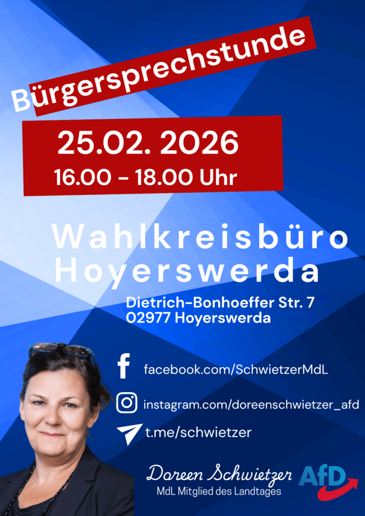 Unsere Wahlkreisabgeordnete MdL Doreen Schwietzer ist am 25. Februar 2026 für Sie vor Ort, um mit Ihnen ins Gespräch zu kommen.