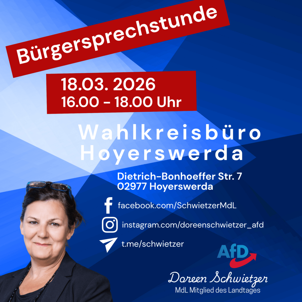 Unsere Wahlkreisabgeordnete MdL Doreen Schwietzer ist am 18. März 2026 für Sie vor Ort, um mit Ihnen ins Gespräch zu kommen.