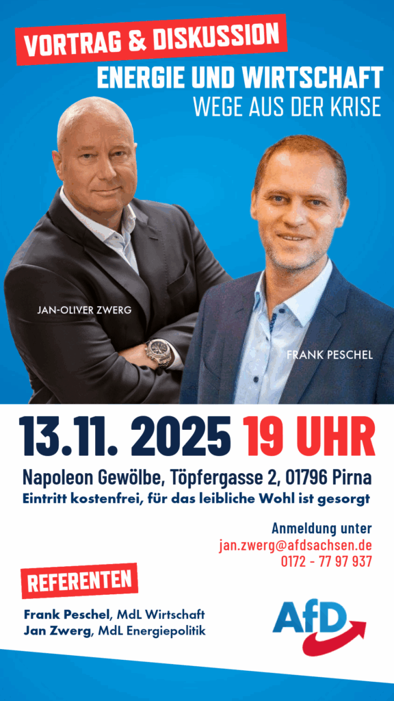 Aufgrund einer begrenzten Platzkapazität bitte ich ausdrücklich um rechtzeitige Anmeldung per E-Mail an jan.zwerg@afdsachsen.de oder telefonisch unter 0172 7797937.