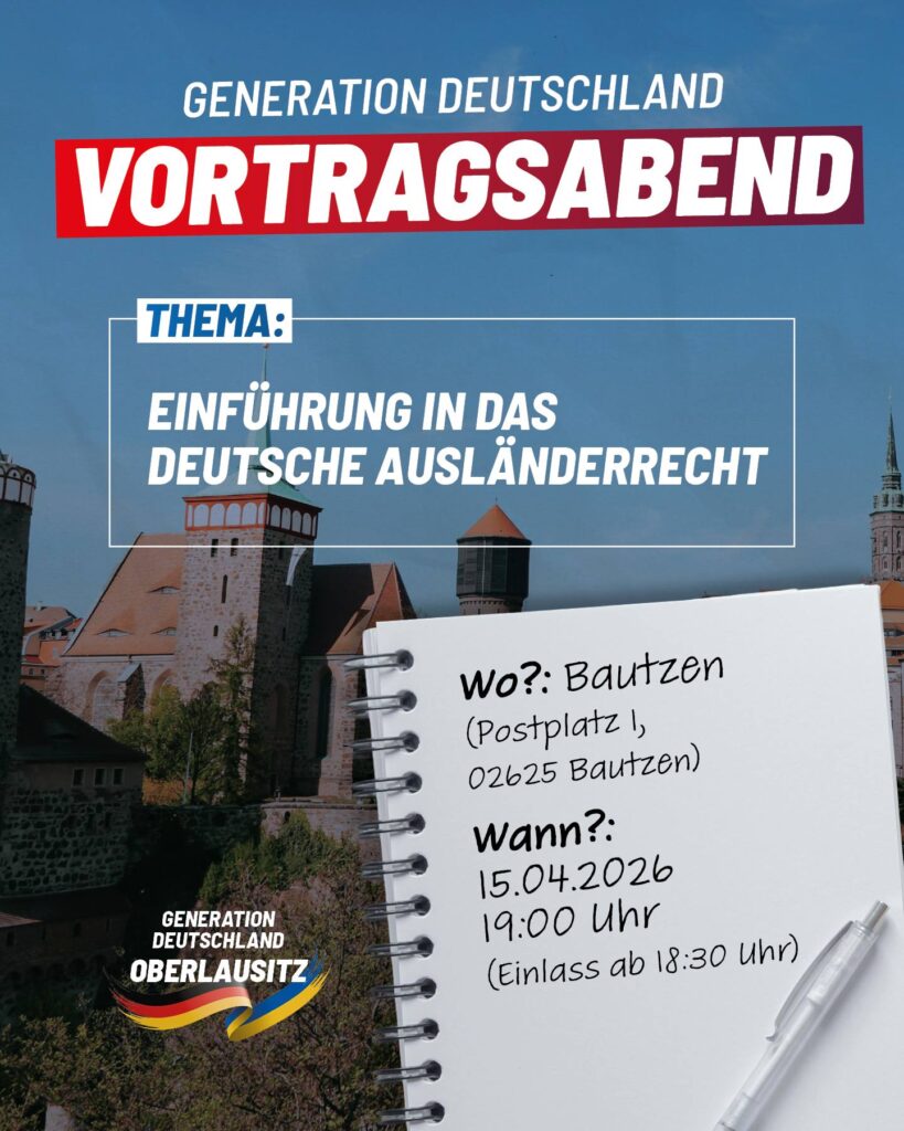 Du bist zwischen 16 und 35 Jahre alt? Dann laden wir dich herzlich zu einem Vortrag zum Thema „Einführung in das deutsche Ausländerrecht“ ein. Die Veranstaltung findet am 15.04.2026 um 19:00 Uhr in Bautzen statt.
