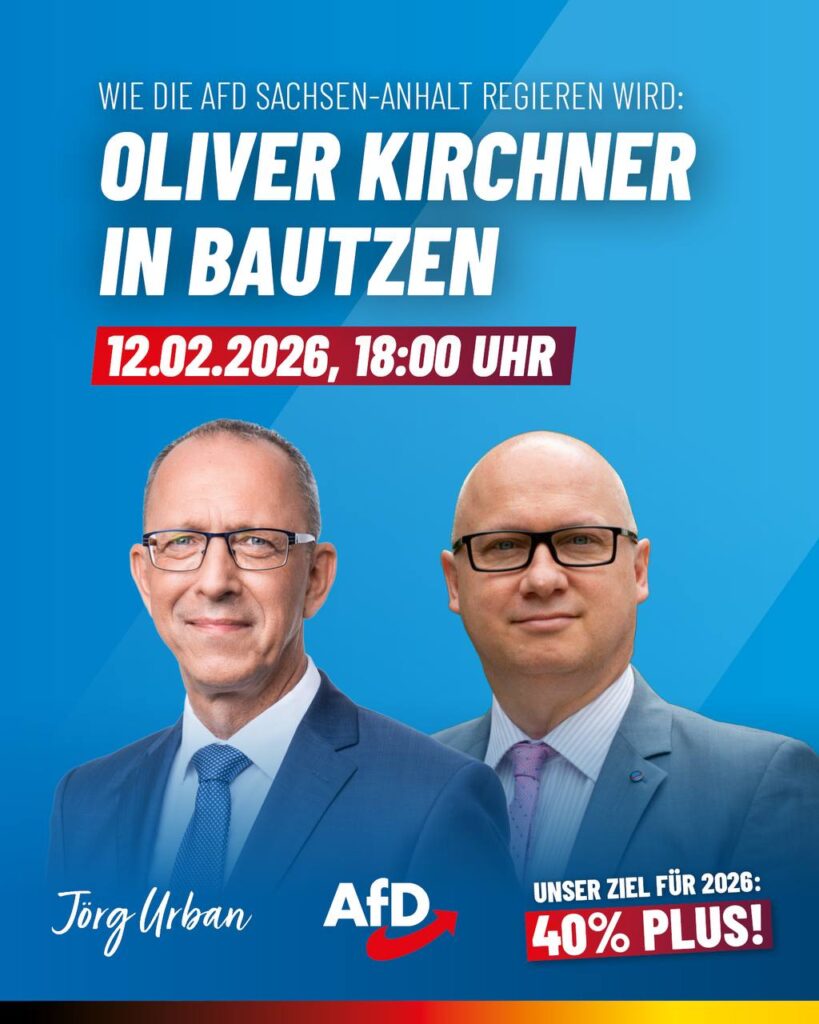ich lade Sie herzlich am Donnerstag, den 12.02.2026 um 18:00 Uhr, zum nächsten Vortragsabend ein. Im Rahmen der Veranstaltung wird MdL Oliver Kirchner über das Thema „Wie die AfD in Sachsen-Anhalt regieren wird“ referieren. Im Anschluss besteht die Möglichkeit zu Austausch und Diskussion.